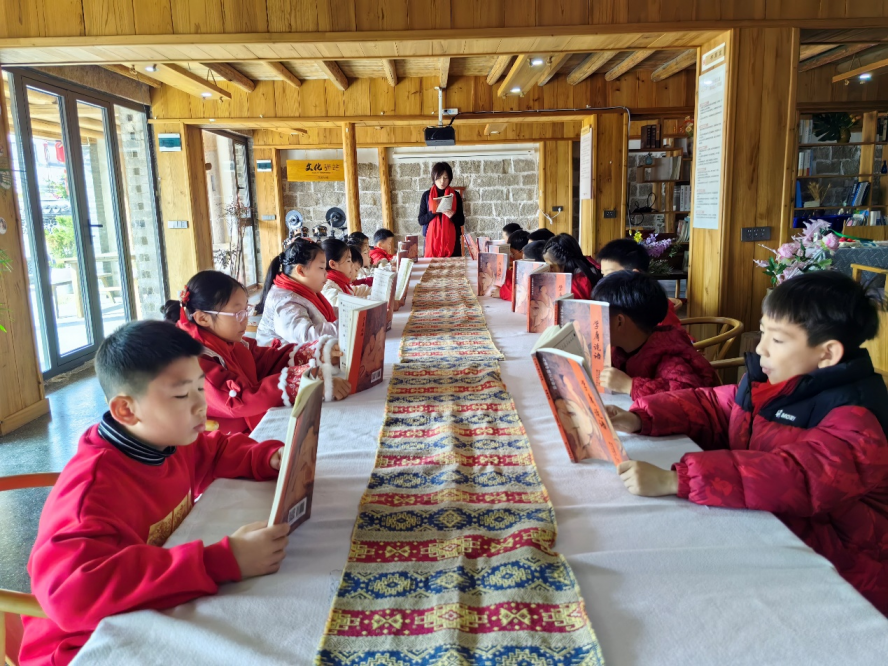 随后,队伍走进又见柒间文化空间。原木搭建的讲堂温馨雅致,长桌铺着织锦桌旗,孩子们围坐成整齐的行列,继续深入诵读经典。室内静谧的氛围与孩子们专注的神情相映成趣,让传统文化在字里行间自然流淌,为这个冬日增添了几分书香气息,浸润着每个孩子的心田。