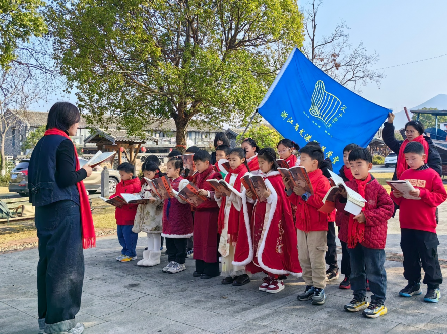 1月17日上午,浙江龙港孔子学堂子路班全体学员及家长在学堂负责人孔爱月老师的带领下,一行40余人走进龙港市乾头村,开展了一场融户外诵读、乡土探访与文化浸润于一体的游学活动。孩子们在寻美乡村间感悟文脉,在经典诵读中浸润儒风。