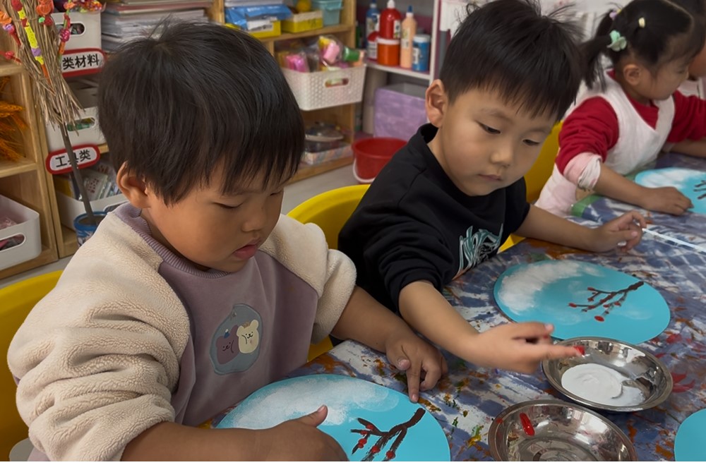 活动现场,孩子们化身小小创作者,在老师的耐心引导下,沉浸式体验拓印乐趣。孩子们用稚嫩的小手,蘸取颜料拓印出遒劲的梅枝,再用指尖点染出点点红梅,在浅蓝色的卡纸上,一朵朵梅花在“积雪”中傲然绽放,每一幅作品都饱含着孩子们对冬日的独特理解。“墙角数枝梅,凌寒独自开。”在拓印与点染的过程中,孩子们不仅锻炼了手部精细动作与色彩感知能力,更在传统文化的氛围中,读懂了梅花坚韧不拔、傲雪迎春的品格。