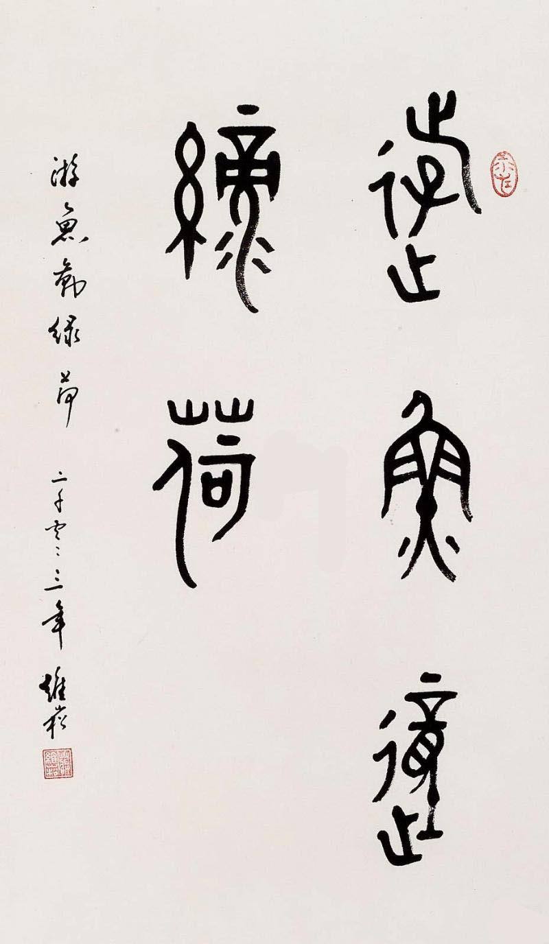 研究蒋先生艺术道路和艺术成就,笔者深深感到自己私心推崇和追求的“以人格、学问滋养艺品》的治艺准则在先生身上得到了天衣无缝地体现。面对先生的艺术作品,我们每个人了解他的为人,了解他的艺术思想,从而也了解他艺术追求的人,都会感受到一种惊人的和谐。那就是他那严谨、静穆的金文,心气和平的行书,庄峻有法的小篆,淳朴古淡的隶书,神清骨秀的篆刻,同他磨而不磷、涅而不缁的人格精神,高古超迈的胸襟情怀,博闻卓见的学养学识,科学、缜密的治学态度,甚至同他温雅、谦和的步履神态和骏骨逸情等,都达到了高度地和谐统一。
