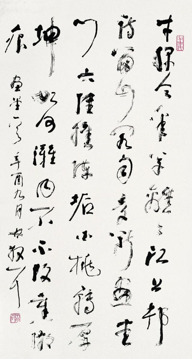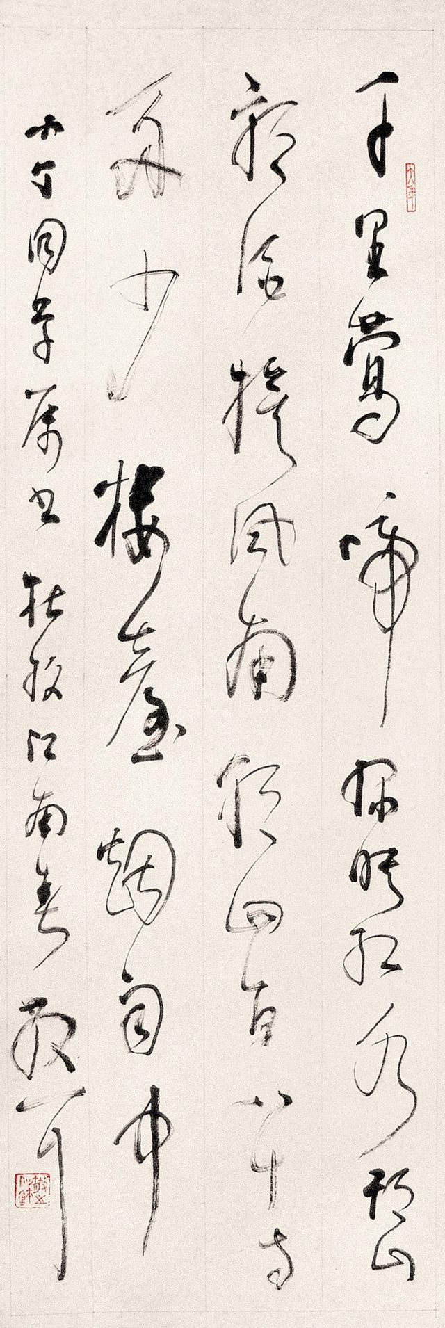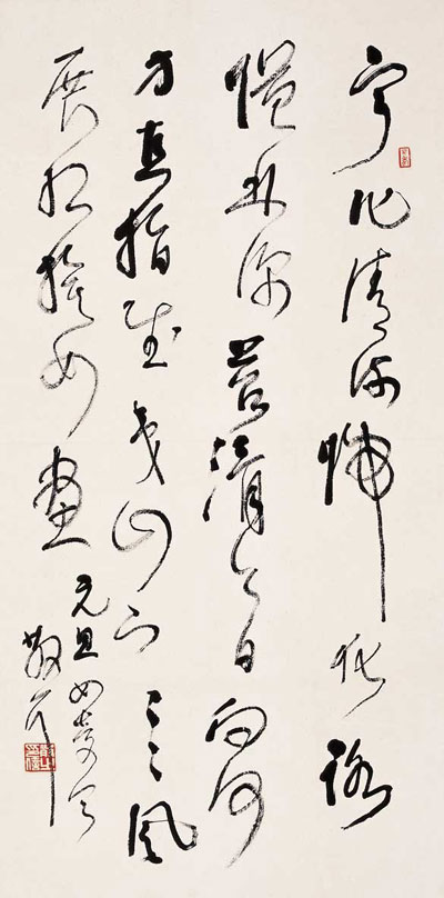 林散之(1898一1989),安徽和县乌江人。原名以霖,号三痴,后改名散之,别号左耳、散耳、聋叟、江上老人。林散之童年即喜涂鸦,十四岁丧父,由笔者外祖父曾梓亭介绍,至南京跟张青甫学习工笔人物画,练就基本功。此后随乡亲范培开先生学习书法,范先生授以安吴执笔之法,双钩悬腕,中锋竖管,打下了扎实的基础。三十以后,由含山进士张栗庵引荐,负籍沪上,拜黄宾虹为师,得“五笔七墨”之秘。一九三三年,遵黄老“读万卷书,行万里路”教导,开始影响一生的万里之行。散之晚年历数自己学书历程道:“余十六岁始学唐碑,三十以后学行书,学米;六十岁以后学草书。草书以大王为宗,释怀素为体,王觉斯为友,董思白、祝希哲为宾。始启之者,范先生;终成之者,张师与宾虹师也。此余八十年学书之大略也。” 秋水老师谓:“散老惯长锋羊毫,蘸水,后掭墨,力运笔端,墨注纸上,水墨交融,渗化洇散,有意想不到的情趣。锋长则弹强,含墨量多,他以娴熟的手法,提按转折,涩进疾阻,似欹反正,将倒复起,曲处见直,圆中寓方,浓纤长短适度,燥润枯湿合宜,但觉一片化机,满纸精彩。”