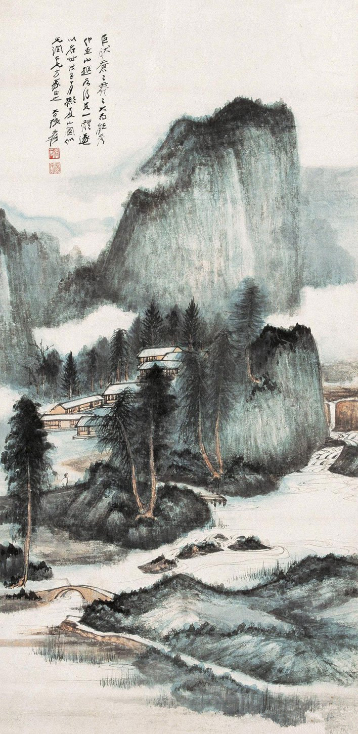款识:巨然苍苍茫茫大而能秀,仲圭山樵各得其一体,遂以名世。戊子十月拟夏山图,似光润仁兄方家正之,大千张爰。印文:张爰、蜀客。