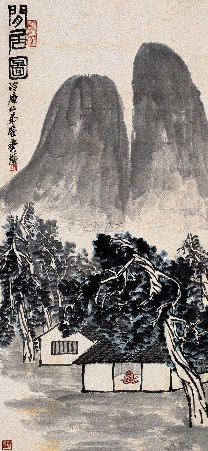 《闲居图》山势浑圆,便与桂林之山势极似。淡墨双峰用笔可谓极拙极厚,而柏树躯干,以双钩穿插,可谓极巧极空灵,真正体现了齐白石巧拙互用的艺术思想,以及他的以“我家笔墨,写我家山水”的艺术追求。齐白石早岁为生活驱驰,流离转徙,晚年定居北京,却厌惧复杂炎凉的人际关系,依恋恬静隐逸的世外田园生活,渴望桃花源而不可得。故把全部美好的追忆化作画幅,如他笔下屡屡形容的老家白石铺杏子坞星斗塘的景色。故园山川之秀美,民风之淳朴,令他魂牵梦萦。齐白石的诗,每念及故园,便令人生情。诗人、画家格调的高下,不外乎“情”字,画中有情,诗中有情,便足流传千古。此《闲居图》正是齐白石寄情之作,也是他理想生活的反映。