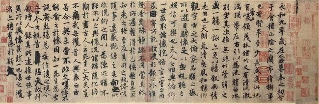 《兰亭序》在章法上属于纵有行,横无列的形式,和其它行书作品相比,《兰亭序》的章法显得自然平和,气韵生动,内涵丰富,它主要有以下三个特点: