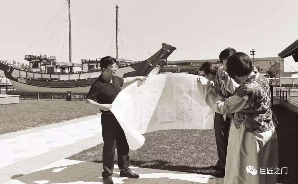 在平城宫遗址公园,观看《遣唐使阿倍仲麻吕》影像片,并在摹拟遣唐使船前向吕旭东一行解读创作构思。