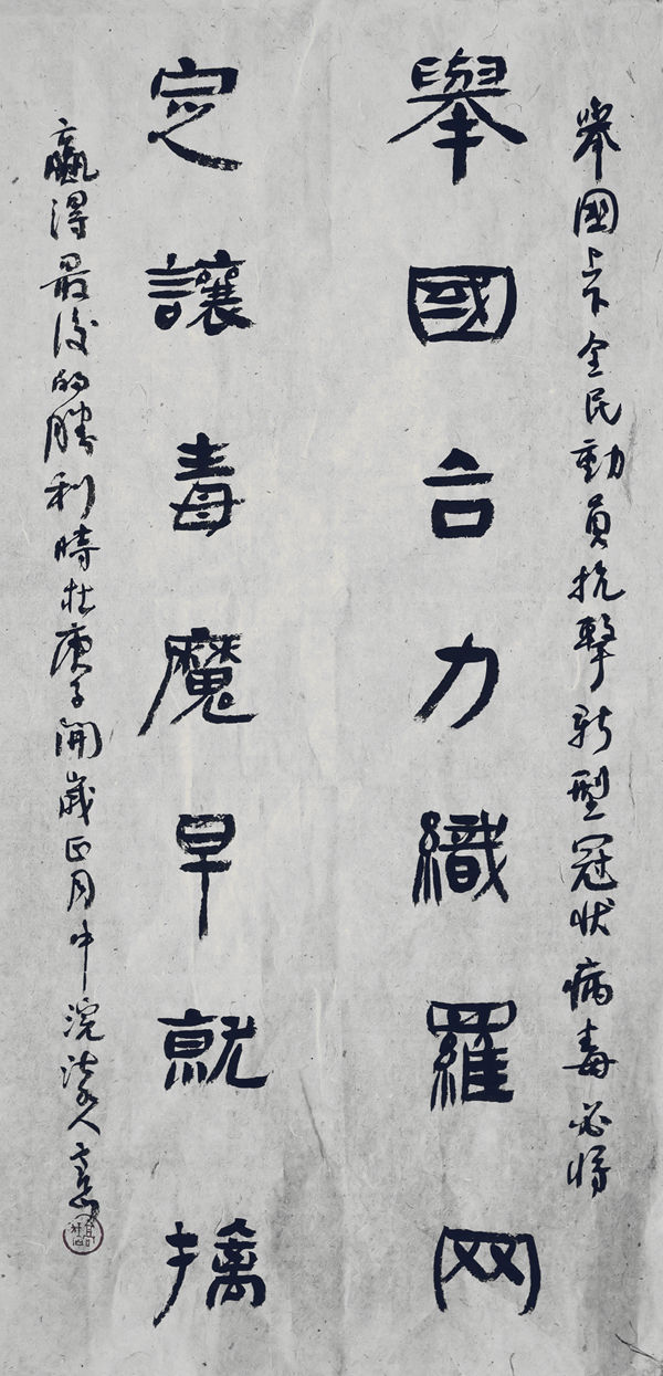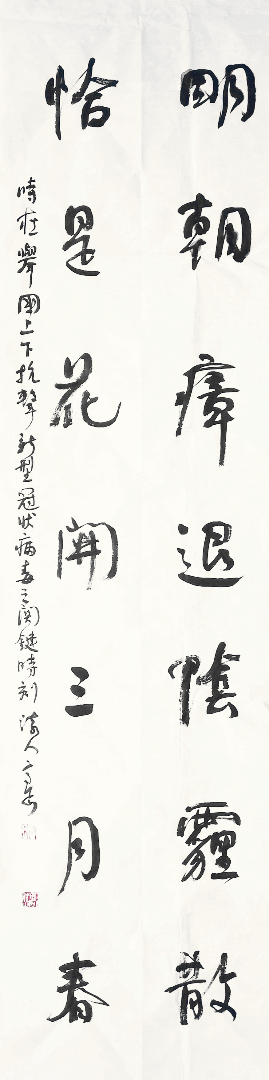 己亥岁末,得知武汉发生首例新型冠状病毒病人。随后看到报道疫情不断告急,我凭着多年在疾病预防工作战线的经验告诉我,疫情可能又要来了……。2003年5月开始非典,2004年发生了禽流感,2009年甲流H1N1在全球爆发。我预感这将又是一场没有硝烟的人民战争即将打响,因为疫情就是生命,刻不容缓。党中央非常英明,非常迅速,大年初一就召开了中央常委会议,专题研究防治新型冠状病毒问题。我所在的原单位一一省卫生健康委员会立即发出通知,要求卫生战线的职工立即返回工作单位,进入战时状态。疫情就是命令,防控就是责任。我作为一名老疾病预防战线的老同志,深知疾病预防工作的艰辛,任务艰巨,责任重大。我默默地为他们鼓劲,给他们加油,我还主动参加了向疫区捐款活动,我坚信有党中央的英明正确坚强的领导,有全体中华儿女的团结协作,有全国卫生战线的广大职工昼夜奋战,定能尽早夺取这场防治新型冠状病毒的最后胜利。特为抗击新型冠状病毒创作了对联两幅,其中隶书内容为:举国合力织罗网,定让毒魔早就擒。行书对联内容为:明朝瘴退阴霾散,恰似花开三月春。