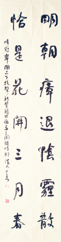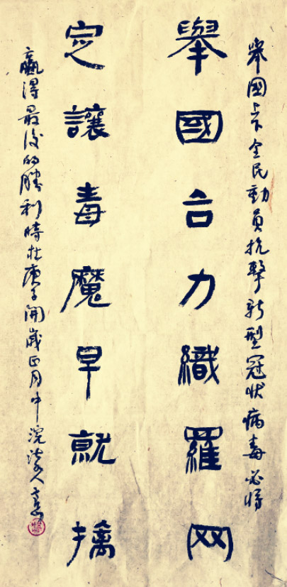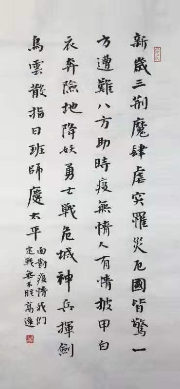 高岱特地为抗击新型冠状病毒创作了两幅对联,其中隶书内容为:举国合力织罗网,定让毒魔早就擒。行书对联内容为:明朝瘴退阴霾散,恰是花开三月春。高岱的女儿,美术学书法方向博士、山东财经大学艺术学院讲师高远激情创作了两幅小楷。