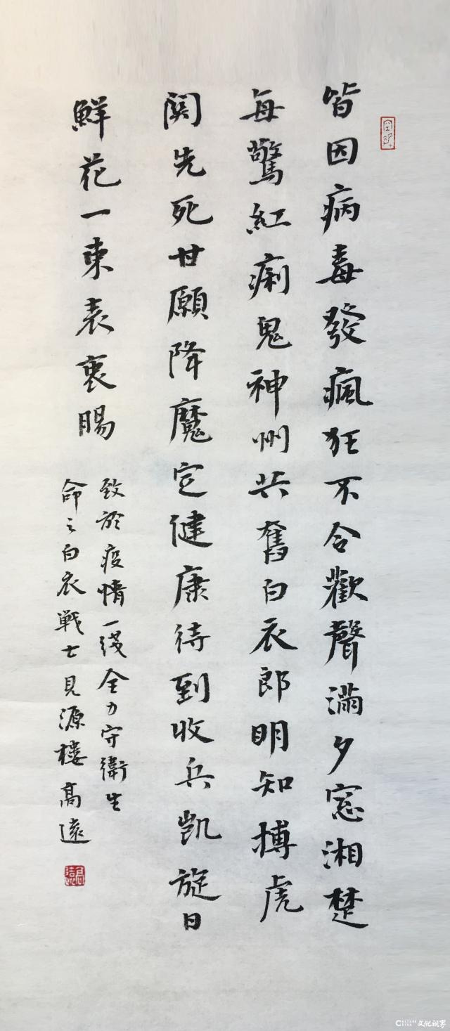 文化视界网报道 面对新型冠状病毒感染的肺炎疫情爆发,山东省广大文艺工作者潜心创作,用优秀的作品鼓舞着人民群众战胜疫情的信心。中国书法家协会会员、山东省书法家协会理事、1995年山东省十大杰出青年书法家高岱和其女儿高远也在第一时间创作防疫主题书法作品,为奋战在一线的防疫逆行者加油,表达了书法家关注人间世情和携手抗疫胜利信心。