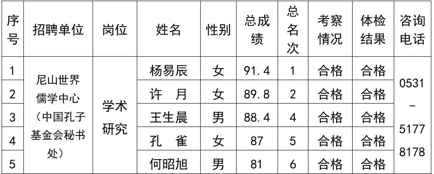 按照中共山东省委组织部、山东省人力资源和社会保障厅《关于印发2024年度省属事业单位公开招聘工作实施方案的通知》(鲁人社发〔2023〕14号)和《尼山世界儒学中心(中国孔子基金会秘书处)及所属事业单位2024年公开招聘工作人员简章》等相关规定,尼山世界儒学中心(中国孔子基金会秘书处)组织完成了2024年公开招聘工作人员考试、考察、体检等工作,现对拟聘用人员进行公示。