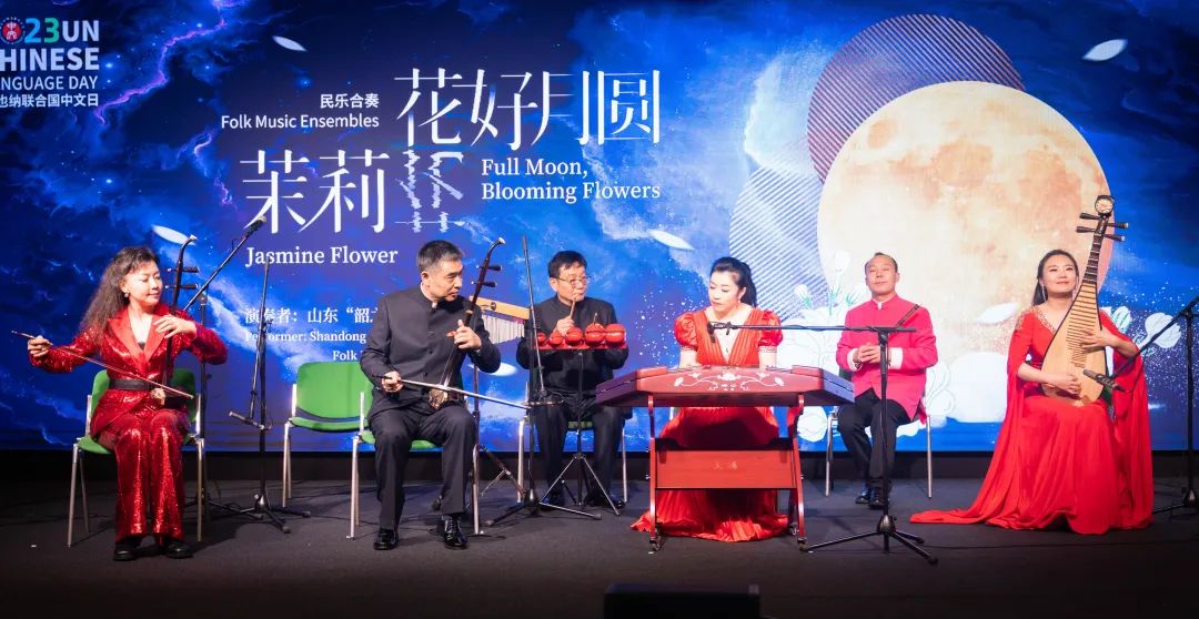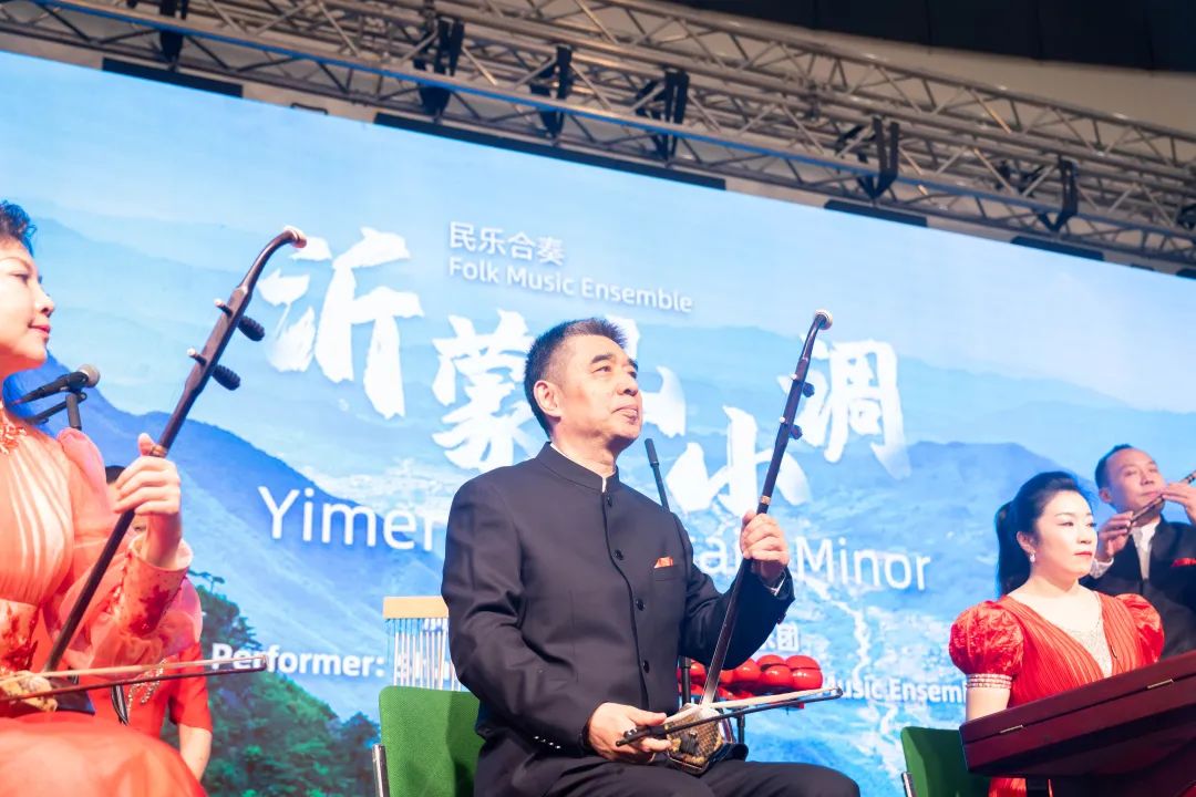 开幕式文艺演出环节,中外嘉宾们共同欣赏了由山东“韶之韵”民乐团现场演奏的《沂蒙山小调》《花好月圆》、《茉莉花》、《赛马》等中国传统民乐曲目。