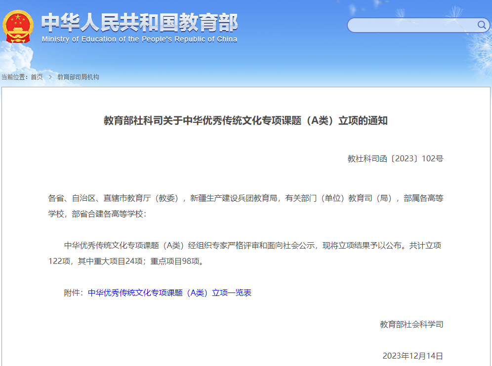 12月14日,教育部社会科学司发布了关于中华优秀传统文化专项课题(A类)立项的通知。尼山世界儒学中心会同教育部社会科学司、中共山东省委宣传部共同设立的中华优秀传统文化专项课题,是为深入学习贯彻党的二十大精神,贯彻落实习近平总书记关于弘扬中华优秀传统文化的系列重要讲话精神,践行“两个结合”,推动文化“两创”,挖掘传承中华优秀传统文化的价值理念和时代精髓。专项课题立项122项,其中重大项目24项,重点项目98项。