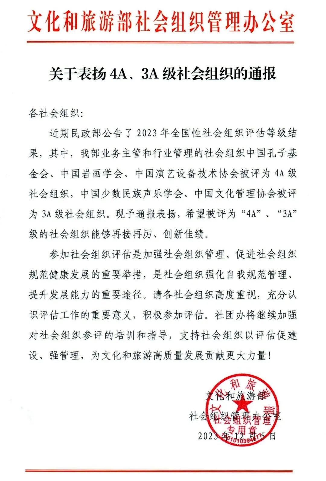 12月中旬,民政部公告2023年全国性社会组织评估等级结果,其中中国孔子基金会被评为4A级基金会。文化和旅游部印发了《关于表扬4A、3A级社会组织的通报》,对中国孔子基金会予以通报表扬。多年来,中国孔子基金会始终担负传承弘扬中华优秀传统文化重要使命,广泛募集社会资金,创新实施了一系列文化品牌项目,为做大做强公益文化事业发挥了积极作用。