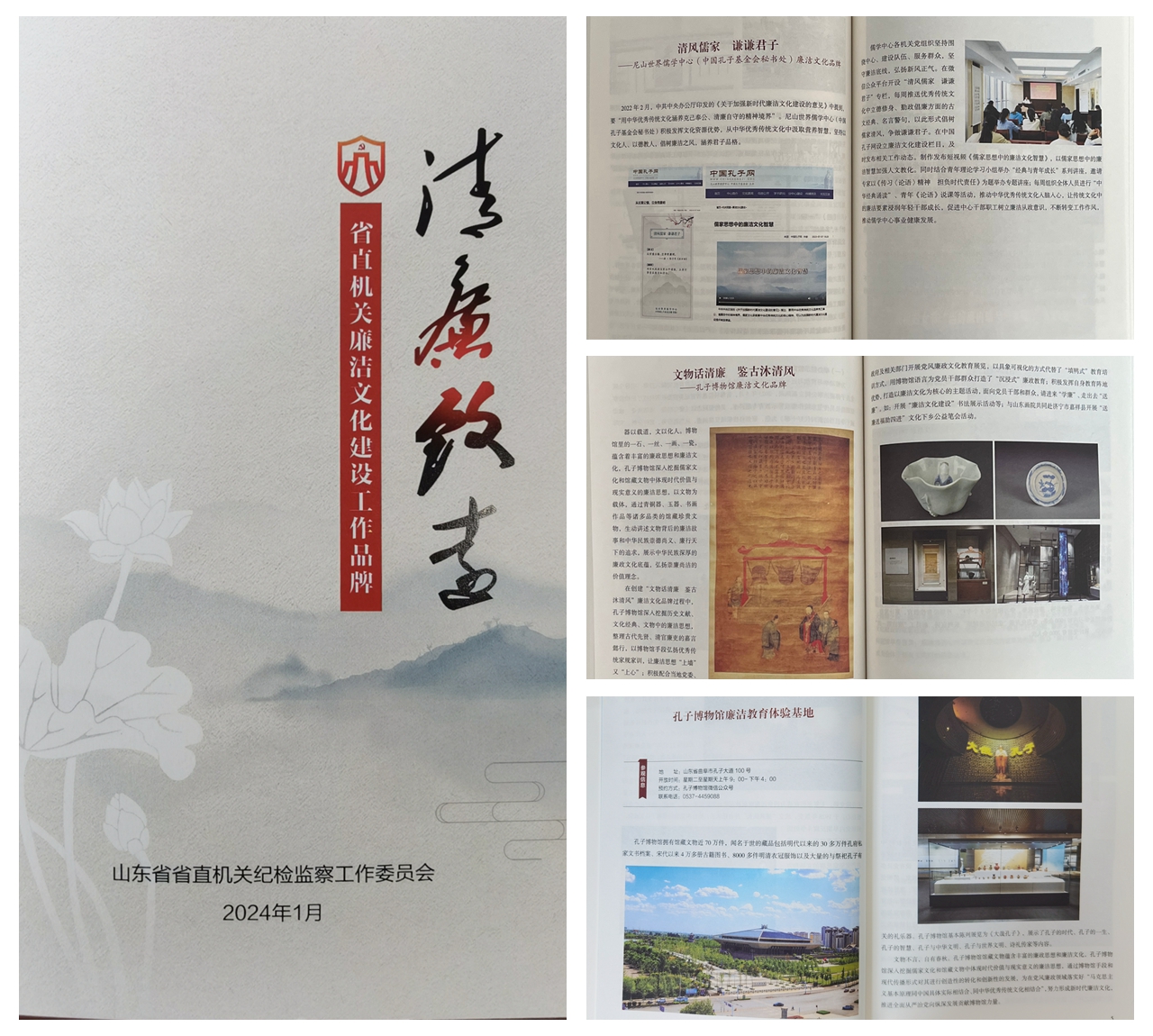 近日,省直机关纪检监察工委印发了《清廉致远——省直机关廉洁文化建设工作品牌》一书,尼山世界儒学中心(中国孔子基金会秘书处)廉洁文化品牌成功入选。此书是为了展示省直机关廉洁文化建设成果汇编而成,收纳了23个省直部门廉洁教育阵地,38个廉洁文化工作品牌、19项廉洁文化建设特色工作。尼山世界儒学中心(中国孔子基金会秘书处)入选的工作品牌有“清风儒家 谦谦君子”廉洁文化品牌、孔子博物馆“文物话清廉 鉴古沐清风”廉洁文化品牌,孔子博物馆廉洁教育体验基地入选阵地建设栏目。