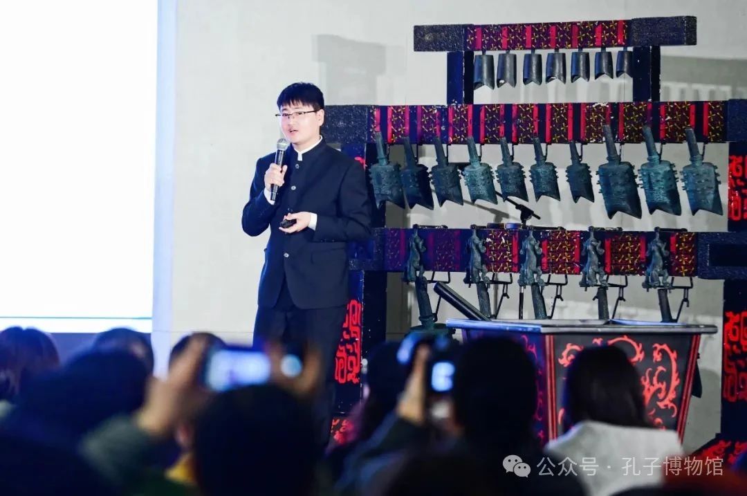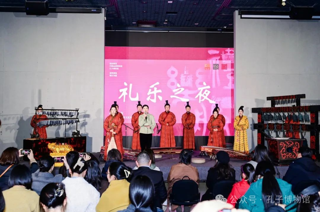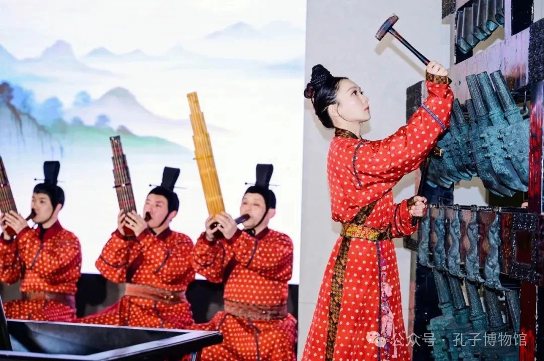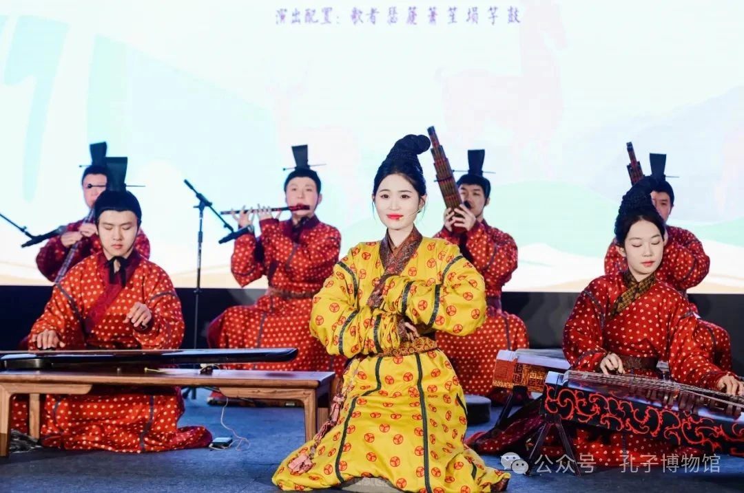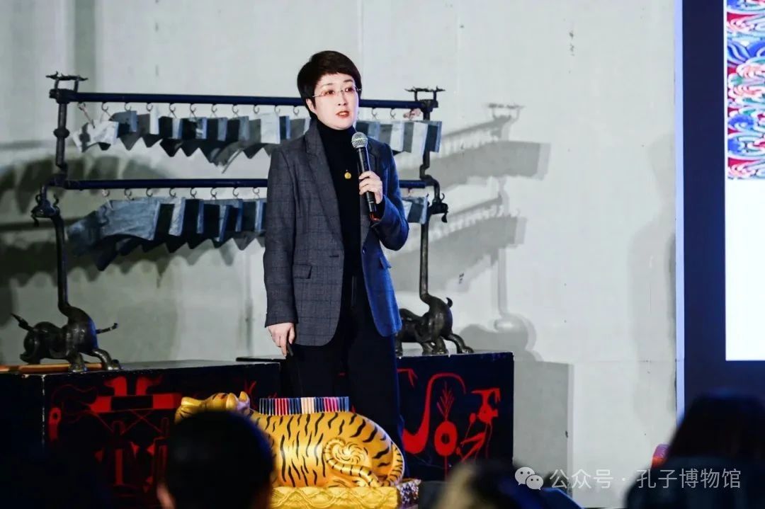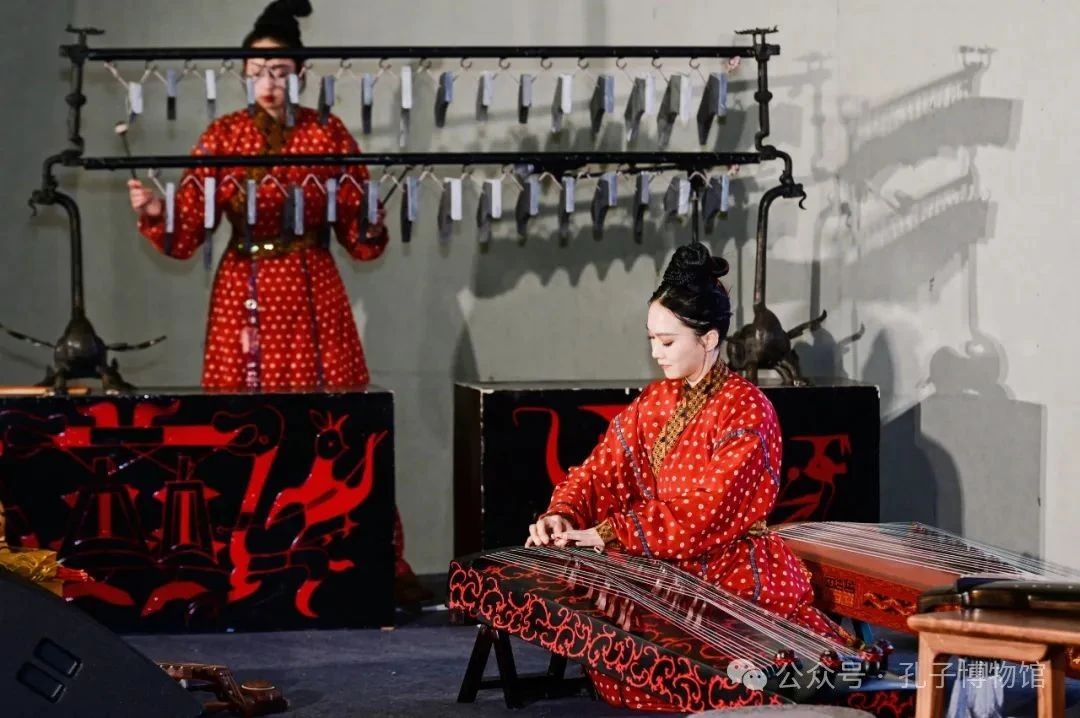开幕式当晚,孔子博物馆和中国丝绸博物馆共同举办了“礼乐之夜”活动。孔子博物馆孔府旧藏服饰研究中心主任徐冉带来《齐明盛服以承祭祀》主题分享,通过对明代衍圣公祭服的解读,剖析明代服饰在礼仪文化中的重要作用。孔子博物馆典藏部主任褚红轩为观众带来了《毕诚毕敬-谈孔子博物馆藏清代兽面纹掐丝珐琅五供》主题分享,让观众对“五供”的历史源流与特点有更深入的了解。此外,孔子博物馆的箫韶乐团围绕“礼、乐、歌、舞”多途径探索,对传世古曲进行了二次编排复原。其中,钟、磬、琴、瑟、篪等各类乐器数十件,皆是以出土乐器文物为参照复原而来。此次演出了《诗经•小雅•鹿鸣》《妆台秋思》《凤求凰》《春江花月夜》等曲目。