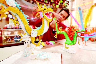 山东省临沂市沂南县红石寨非物质文化遗产博物馆,面塑艺人在展示生肖龙面塑作品。新华社发