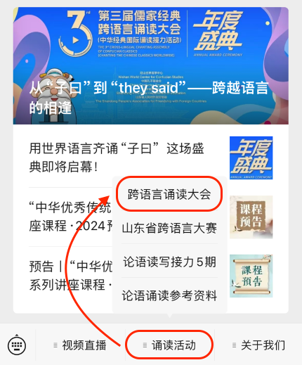 请关注“尼山世界儒学中心”公众号,点击底部菜单“诵读活动”—>”跨语言诵读大会”,进入微信小程序。