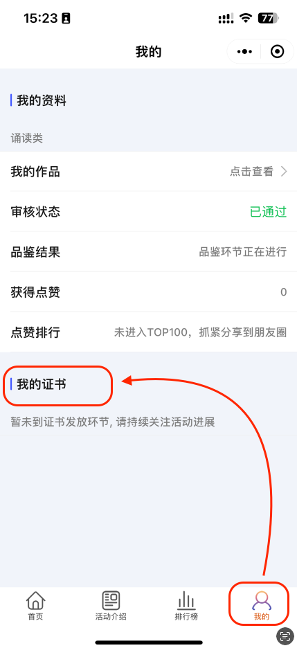 未登录微信小程序的用户,请点击小程序底部菜单“我的”,根据系统提示使用报名时填写的手机号登录。登录成功后滑动屏幕至最底部,可以看到作品所获得的1个或多个证书。