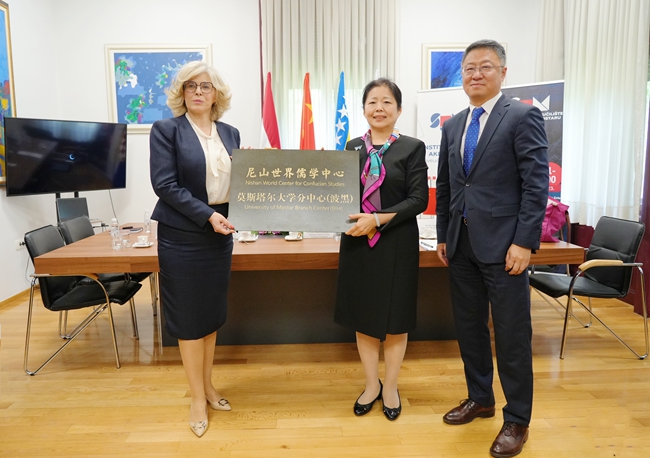 5月21日,国承彦、缪大可、莫斯塔尔大学副校长桑尼亚·比亚克斯奇共同为尼山世界儒学中心莫斯塔尔大学分中心挂牌,并围绕分中心项目合作、联合开展文化交流等事项与有关负责人和专家学者进行座谈交流。