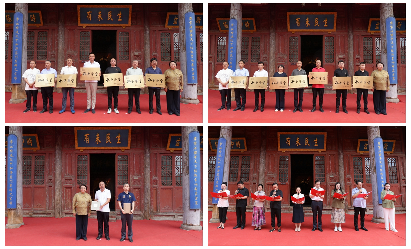 尼山世界儒学中心(中国孔子基金会秘书处)党委委员、副秘书长,孔子学堂推进委员会主任周静,孔子学堂推进委员会副主任、湖南省社会主义学院原副院长刘孝听向2024年新设立的部分孔子学堂授牌。周静代表中国孔子基金会孔子学堂推进委员会向韩城文庙捐赠《孔子圣迹图》。
