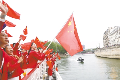 7月26日,中国体育代表团旗手、花样游泳选手冯雨在开幕式上挥舞国旗。 当日,第33届夏季奥林匹克运动会开幕式在法国巴黎举行。 新华社记者 曹灿摄