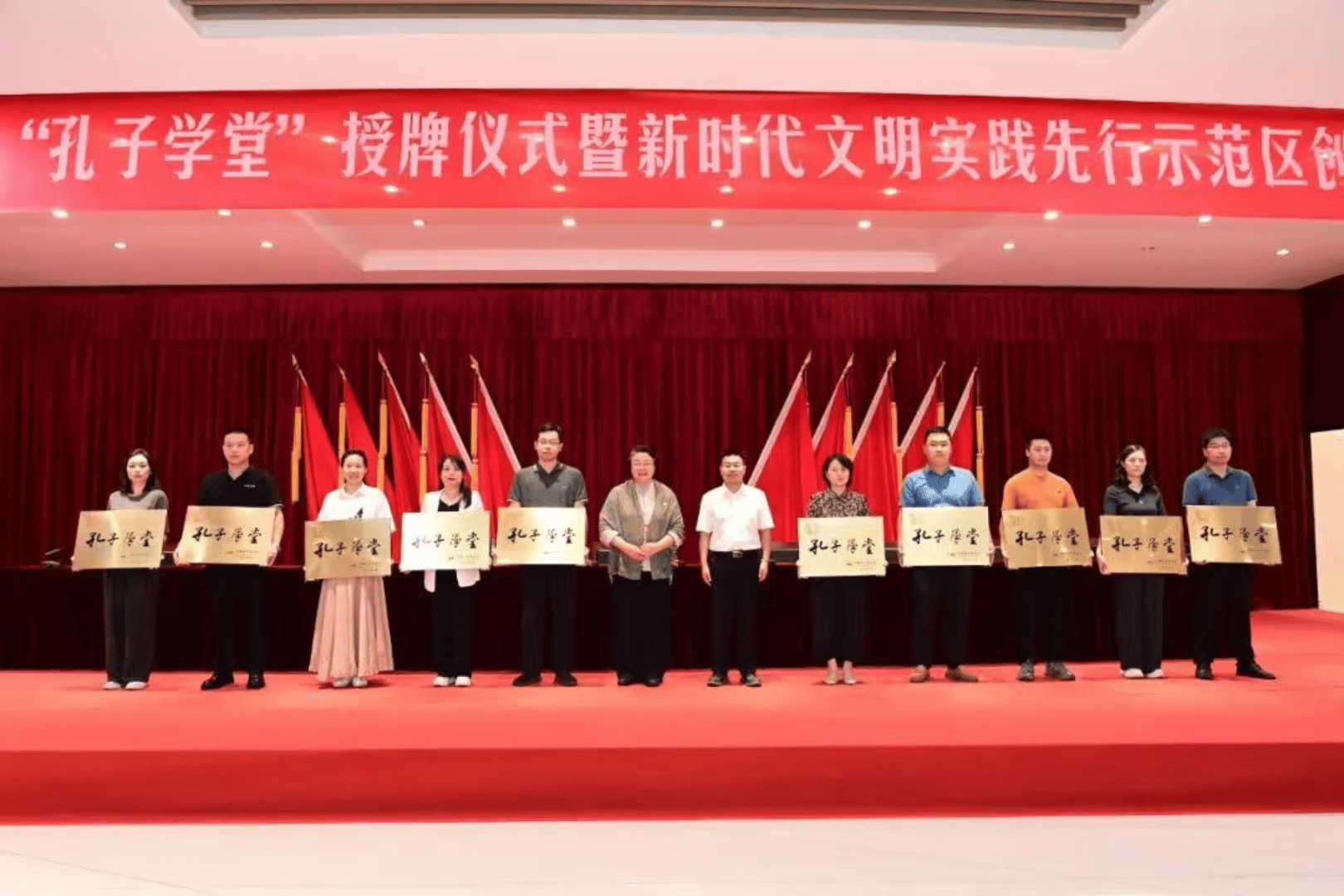周静、赵书政为20家孔子学堂代表现场授牌,山东师范大学侨联原常务副主席、外国语学院原党委书记吕志红及洛邑古城孔子学堂代表作交流发言。
