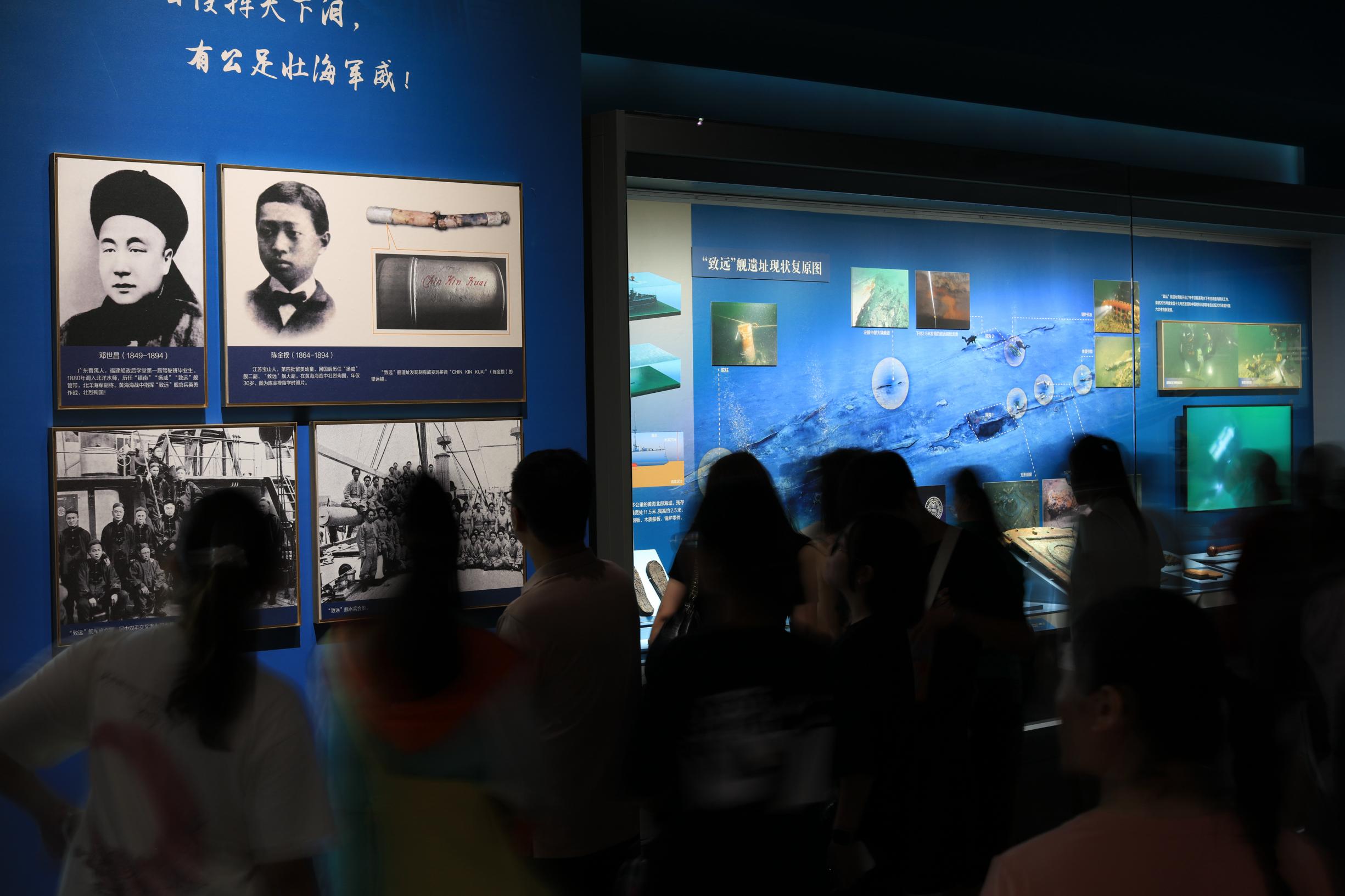 展览分为三个部分,第一部分“归去”通过水下文物、史料记载与历史影像,描绘出北洋海军的兴衰史及甲午海战的惨烈,还有将士们坚韧不拔的战斗精神和英勇气概;第二部分“来兮”则展示了五艘北洋沉舰出水的珍贵文物及水下勘察打捞影像;第三部分“传承”介绍中国水下考古史以及在甲午沉舰的探寻过程中,研究出沉船水下考古的新方法。