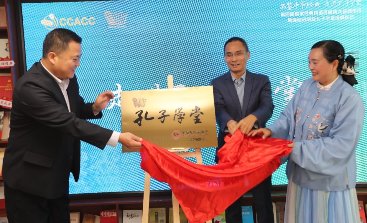 中国孔子基金会孔子学堂推进委员会副主任孙润来宣读了关于成立书香天山科技有限公司孔子学堂的批复函,并与韬奋基金会阅读组织联合会理事、新疆书香天山文化科技有限公司党组织书记、总经理韩芝雄,全民阅读推广人、全国十佳播音主持教师、新疆书香天山科技有限公司副总经理、书香天山科技有限公司孔子学堂负责人何志涓共同为孔子学堂揭牌。