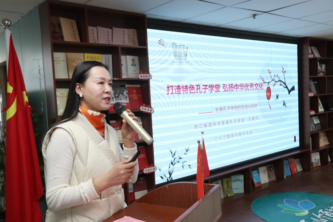 中国孔子基金会孔子学堂推进委员会委员、浙江省温州市龙港孔子学堂的负责人孔爱月作了《打造特色孔子学堂 弘扬中华优秀传统文化》主旨分享,结合龙港孔子学堂的实践和探索,介绍了推动孔子学堂高质量发展的经验和方法,为在场的文化工作者和参与者提供了宝贵启示和借鉴。