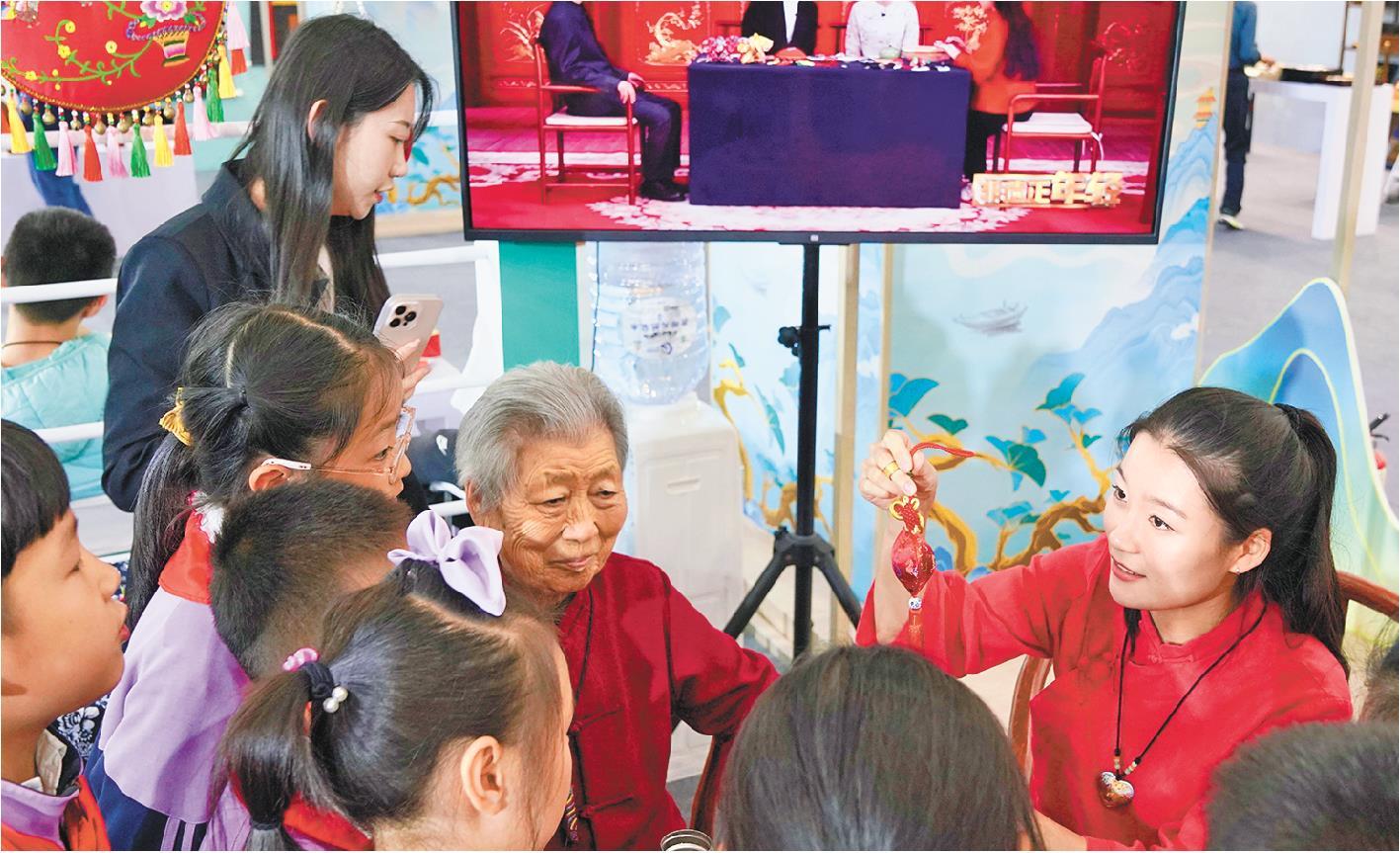 在第八届中国非物质文化遗产博览会上,孙歌尧和王秀英给孩子们讲解香包制作方法。(□记者孙业文报道)