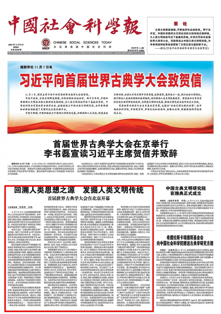 11月7日上午,北京雁栖湖国际会展中心L层大议会厅里气氛庄重热烈。由中国社会科学院、中国教育部、中国文化和旅游部、希腊文化部、希腊雅典科学院共同主办的首届世界古典学大会在这里隆重开幕。中国国家主席习近平、希腊总统卡特里娜·萨克拉罗普卢分别向大会致贺信。