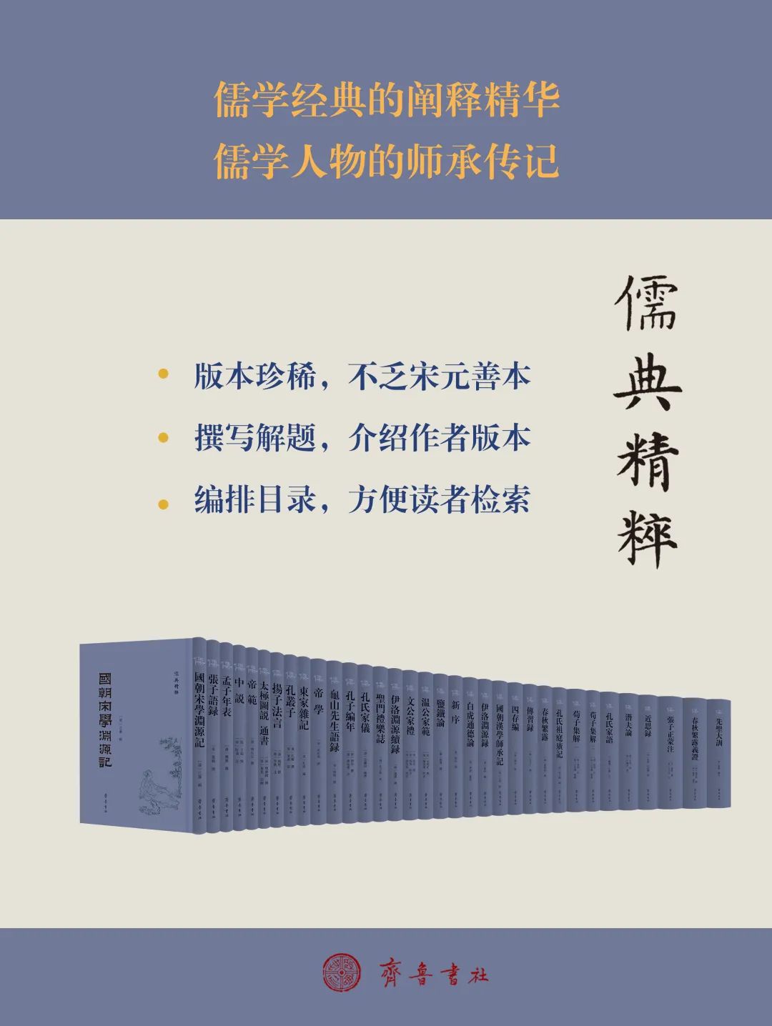 《儒典》是对儒家经典的一次精选和萃编,集合了儒学著作的优良版本,展示了儒学发展的历史脉络。其中,《义理典》《志传典》共收录六十九种元典,由齐鲁书社出版。鉴于《儒典》采用套书和线装的形式,部头大,价格高,不便于购买和日常使用,我们决定以《〈儒典〉精粹》为名,推出精装单行本。