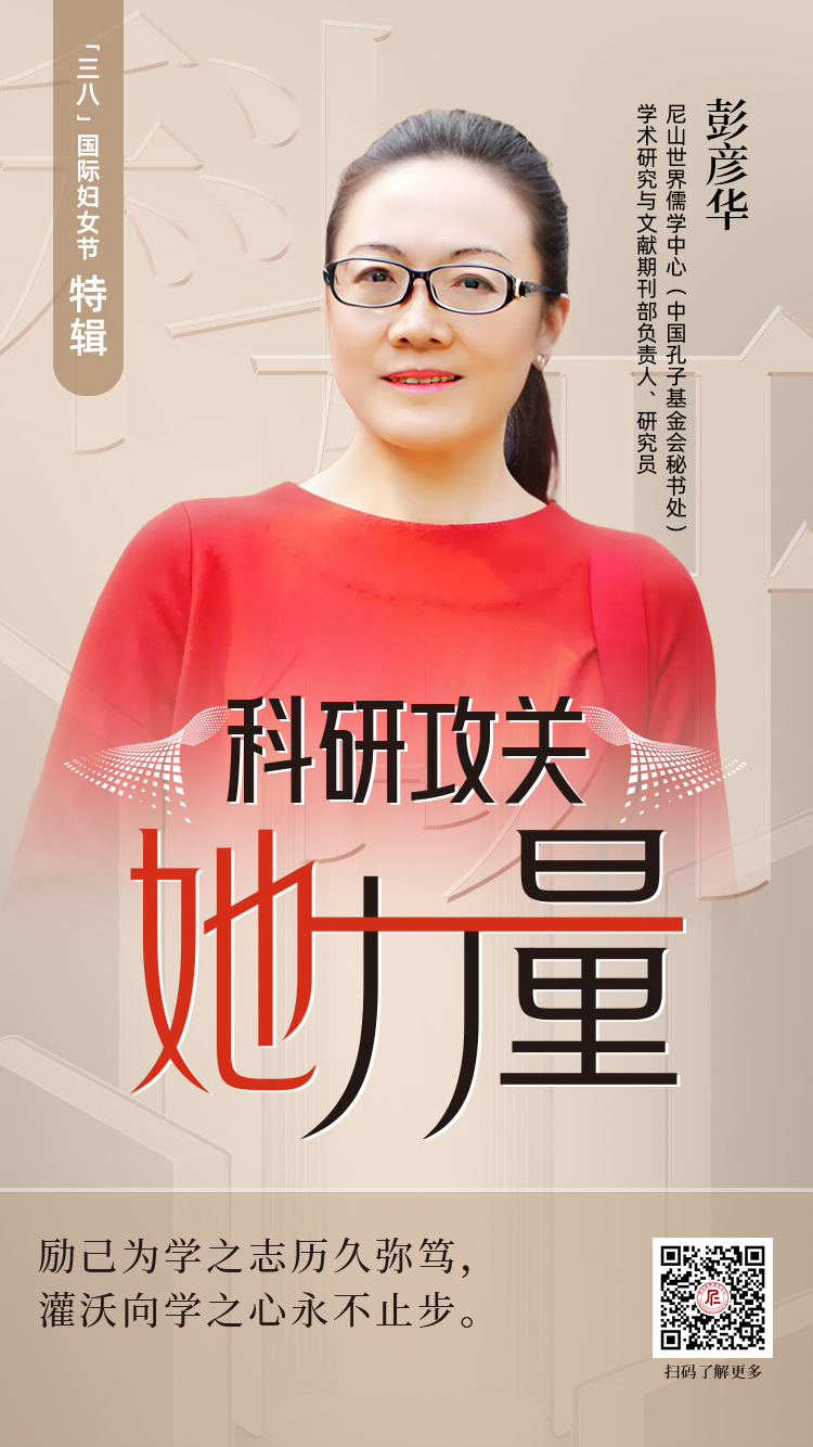 彭彦华,尼山世界儒学中心(中国孔子基金会秘书处)学术研究与文献期刊部负责人、研究员。博观而约取,厚积而薄发。她在儒家哲学与中国思想文化史研究领域深耕三十余年,以扎实的学术功底和深厚的学养,为儒学研究领域注入了新的思想活力。她的治学态度,正如《荀子》所云:“锲而舍之,朽木不折;锲而不舍,金石可镂。”她以坚韧不拔的精神,不断攀登学术高峰。