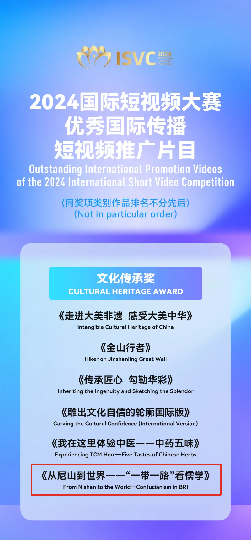 《从尼山到世界——“一带一路”看儒学》获2024国际短视频大赛“文化传承奖”