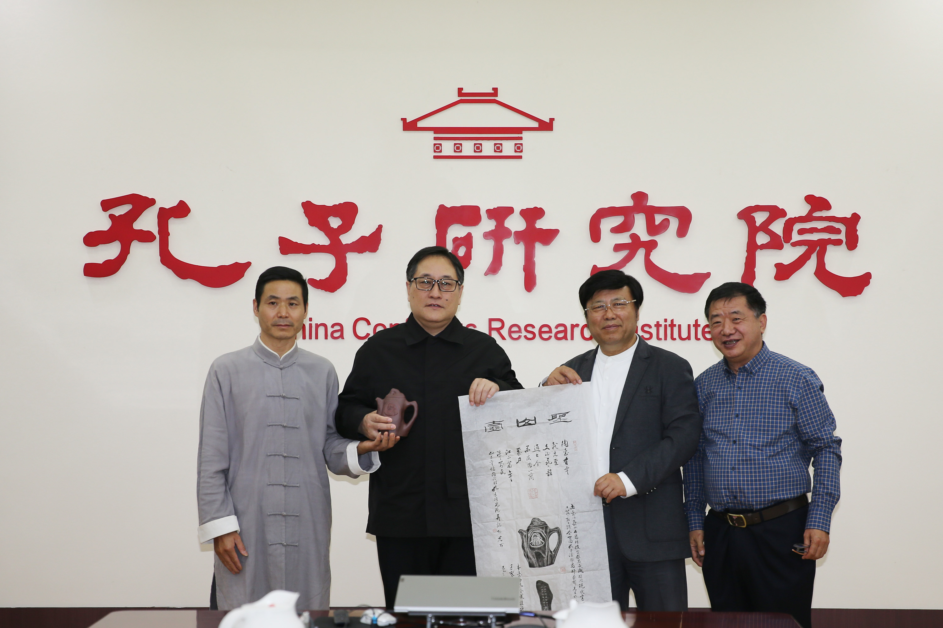 孔维克、吴建荣、季顺林、孔令武向孔子研究院捐赠紫砂壶《孔子》及拓片题跋,刘续兵接收捐赠作品并回赠收藏证书。