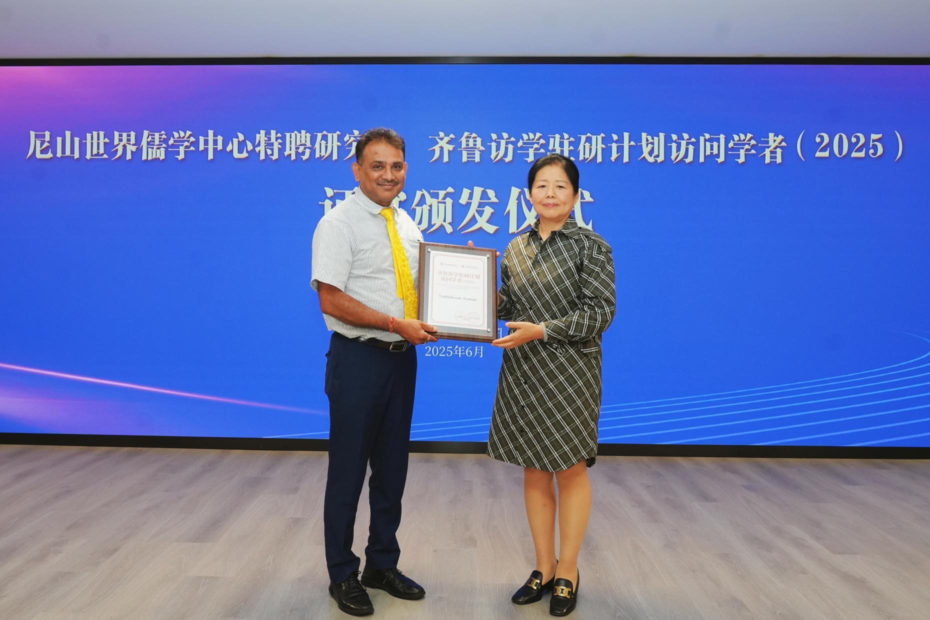 国承彦向玛利亚·马内利、伍晓明、余德烁、许喆、富萍萍颁发“齐鲁访学驻研计划访问学者(2025)”证书和尼山世界儒学中心特聘研究员聘书,向伍晓明颁发图书捐赠证书。