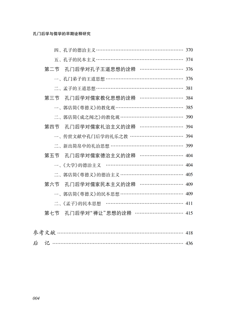 本书是我在2012年申请的国家社科基金青年项目“孔门后学与儒学的早期诠释研究”(12CZX029)的结项成果。我十年前博士毕业,第二年申请成功这一个项目,应该是非常幸运的。我的博士论文选题是“儒家八派的再批判”,最初我列的提纲非常庞大,后来听从我师弟光胜兄的建议,拦腰截断,取了一半作为博士论文,剩下一半后来作为国家社科基金项目的选题。前者在台北花木兰文化公司出版,后者则在人民出版社出版,实属无上荣光。