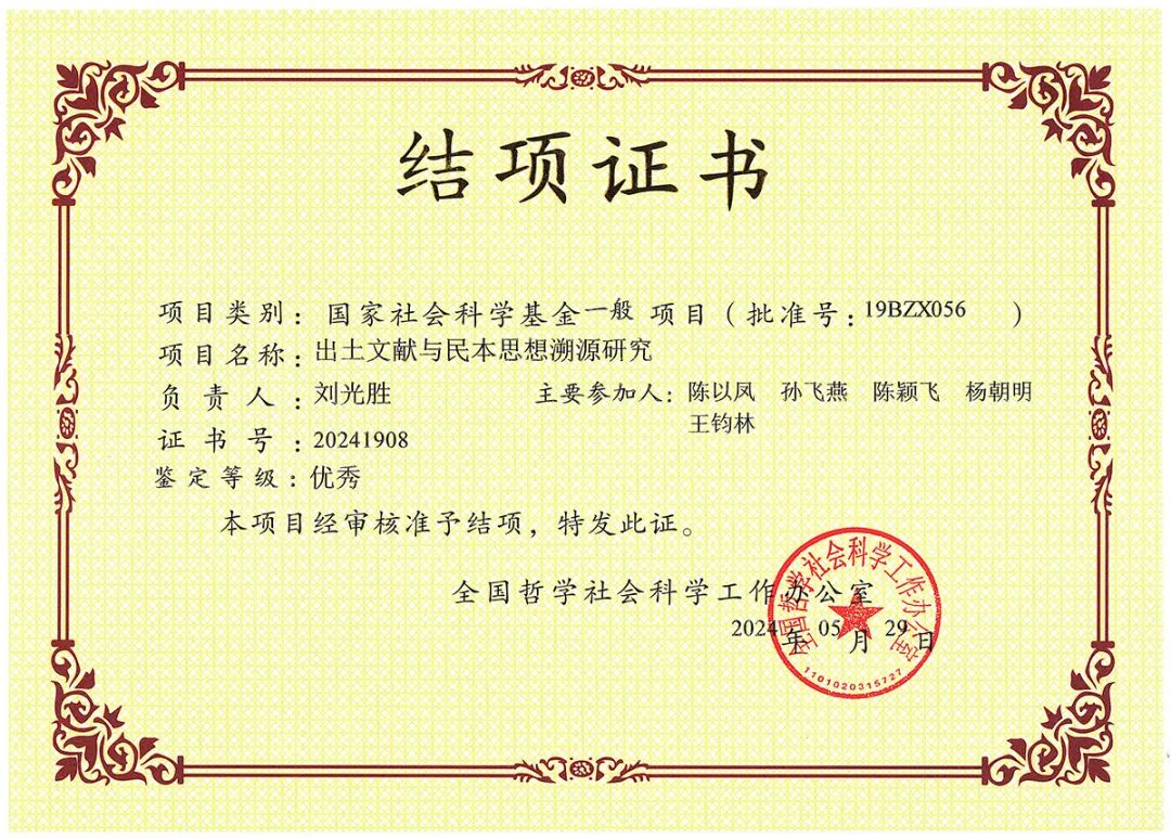 近日,由刘光胜研究员主持的孔子研究院国家社会科学基金一般项目《出土文献与民本思想溯源研究》顺利结项,并获得“优秀”等级。