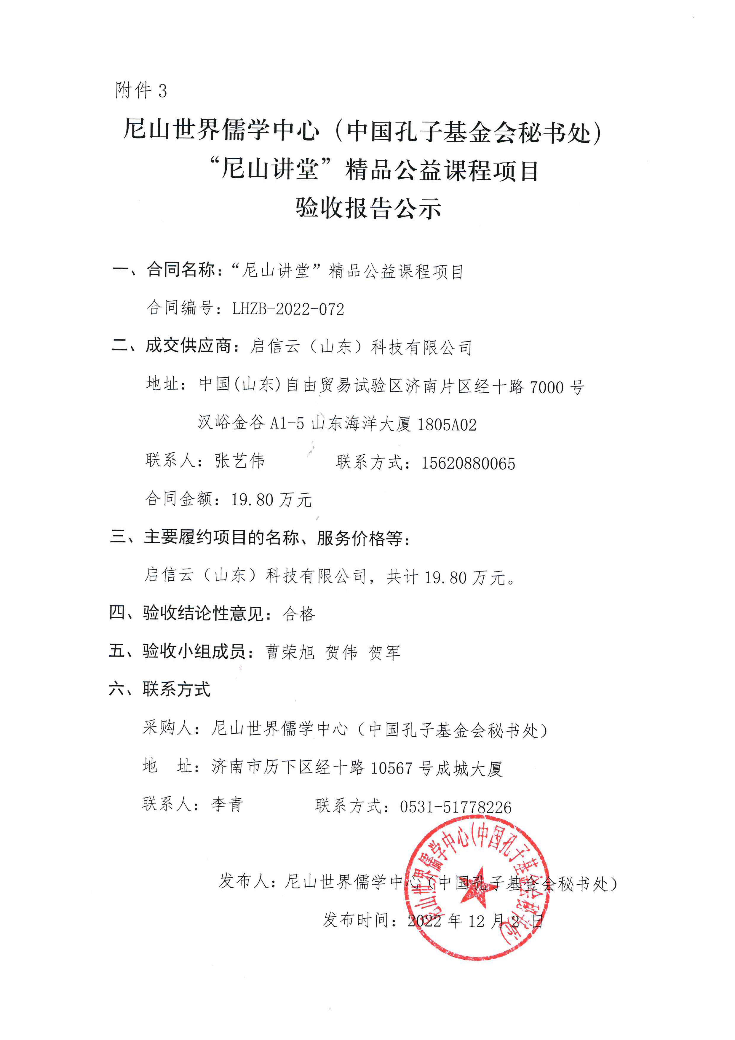 尼山世界儒学中心(中国孔子基金会秘书处)“尼山讲堂”精品公益课程项目验收报告公示