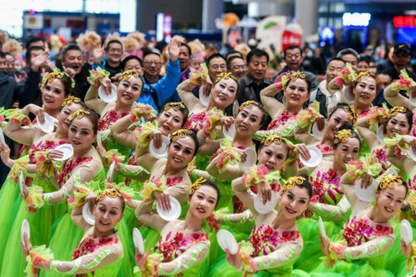 乗客の旅の疲れを癒す高速鉄道駅でのフラッシュモブ 新疆
