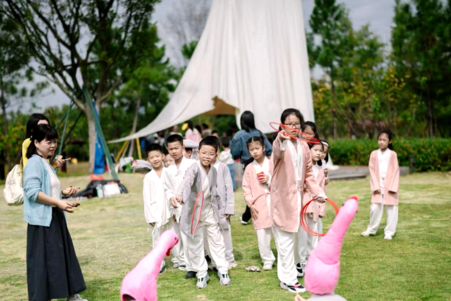 文化探访的沉静氛围尚未消散,“套大鹅”亲子游戏便将现场气氛推向高潮。家长们暂时放下平日的忙碌,与孩子并肩作战——有的瞄准目标屏息投掷,有的为彼此加油鼓劲,湿地公园的草坪上满是欢声笑语。这场简单的游戏,不仅让孩子们收获了成功套中目标的喜悦,更悄然拉近了亲子间的距离,定格下一个个温馨的互动瞬间。
