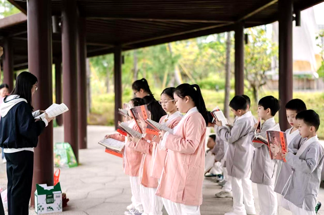 活动伊始,国学诵读环节率先拉开帷幕。孩子们身着统一汉服,双手捧着《学庸论语》,或站立、或围坐,在林芝妈妈温柔且富有节奏的导读声里,齐声朗读《论语》篇章。“学而时习之,不亦说乎?有朋自远方来,不亦乐乎?……”清亮的童声穿过微风,与湿地里的虫鸣、流水声交织相融。古老的经典仿佛被注入自然的温度,悄悄浸润着每个孩子的心灵。