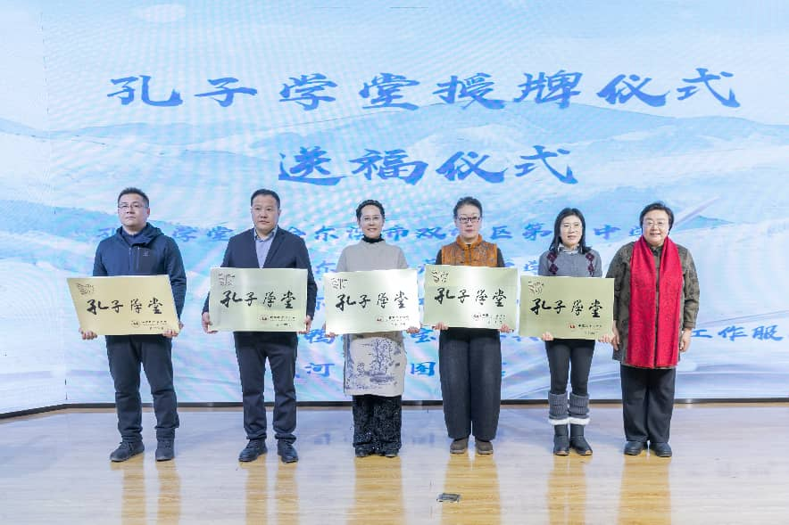 开营仪式上,举行了孔子学堂授牌仪式,周静为哈尔滨市双城区第六中学校等5家单位授牌,并捐赠《论语》等经典文化书籍,以及山东书法家志愿者李玉刚老师的百幅左手手书“平安福”作品。