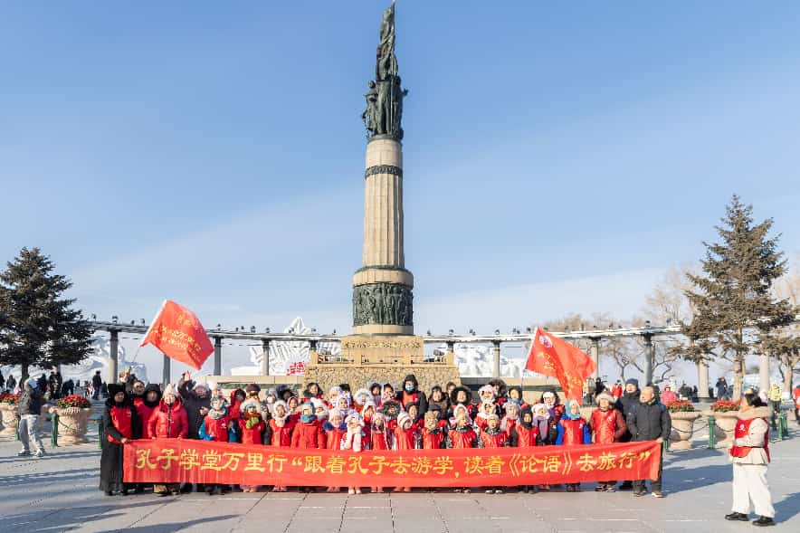 在“论语+冰雪”主题研学环节,两地亲子家庭先后走进哈尔滨防洪纪念塔、太阳岛雪博会、冰雪大世界、哈尔滨文庙、南岗博物馆、中央大街等地标场所,在松花江畔、冰雪秘境中齐诵《论语》精粹篇章与“横渠四句”,在文庙沉浸式体验传统礼仪,在历史街区感悟城市文脉传承,将经典诵读与实地研学、文化体验深度融合,让中华优秀传统文化在行走中可感、可学、可悟,真正实现了“读万卷书、行万里路”的育人目标。