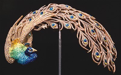 孔雀在东方文化中有着美好的寓意,是印度的国鸟。在19世纪末20世纪初的新艺术运动时期,孔雀成为欧洲艺术家钟爱的设计元素。展览中有一枚孔雀羽饰格外精美,整体镶嵌1742颗钻石,头尾使用錾刻珐琅工艺,还原出孔雀的流光溢彩。1905年,印度大公贾加吉特·辛格在法国巴黎麦兰瑞珠宝店订购了这件孔雀羽饰,后来将它赠给一见钟情的西班牙少女安妮塔·德尔加多。这件珍宝是东西方文化交融的产物,也见证了一个跨越国界、跨越阶层的爱情故事。