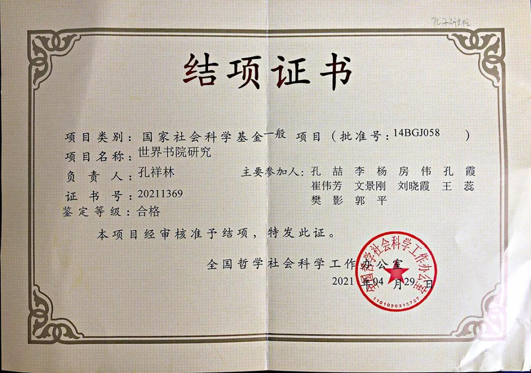 近日,全国哲学社会科学规划办公室公布了国家社科基金年度项目验收结果,孔子研究院孔祥林研究员主持的“世界书院研究”(14BG058)顺利结项。