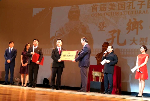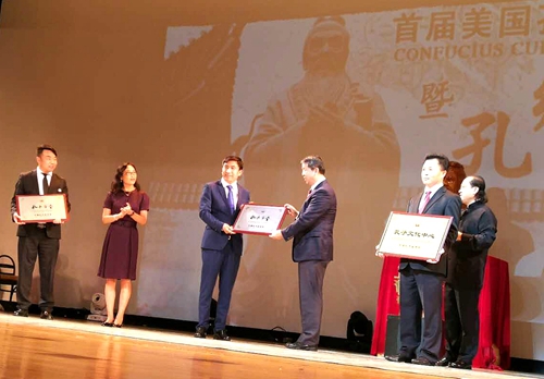 中国孔子基金会海外“孔子文化中心”、孔子学堂在本次活动上正式落户纽约,现场举行了揭牌仪式,牛廷涛副理事长授牌。