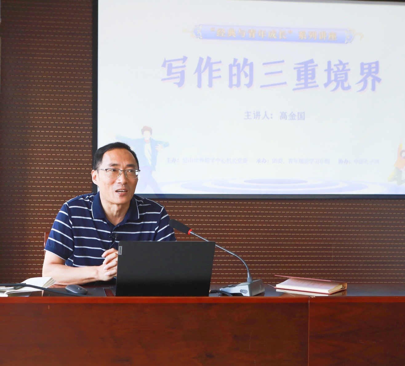 讲座中,儒学中心传播普及部副编审高金国以《写作的三重境界》为题,结合自身学习和写作经历,以新颖的形式就文稿写作的谋篇布局、逻辑层次、内容撰写进行了深入浅出的讲解,鼓励青年干部首先要锤炼扎实的文字功底,写出结构规范的文章,达到有文笔的境界;再次要提升思维能力,让文章有深度有广度有温度,达到有思想的境界;最后要不断扩充知识储备,达到有故事的境界。
