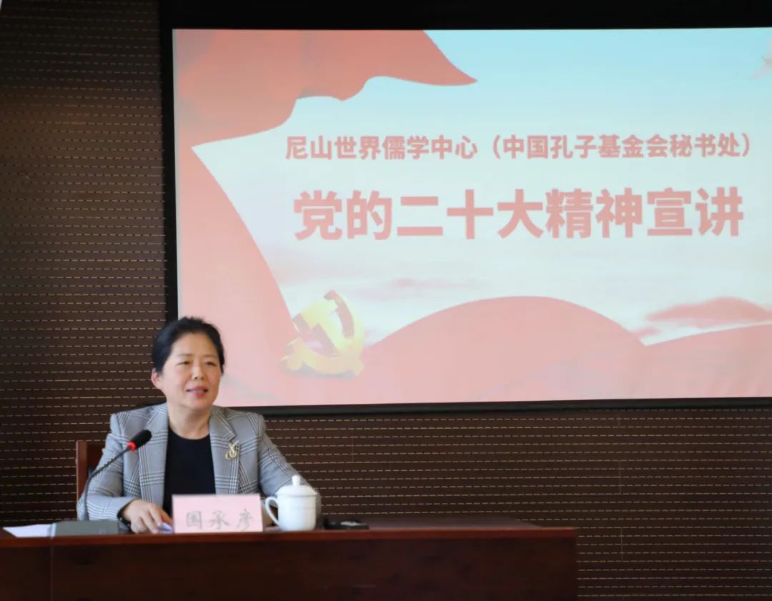 12月1日,省委党的二十大精神宣讲团成员,尼山世界儒学中心(中国孔子基金会秘书处)党委书记、副主任国承彦面向儒学中心全体干部职工,线上线下集中宣讲党的二十大精神。