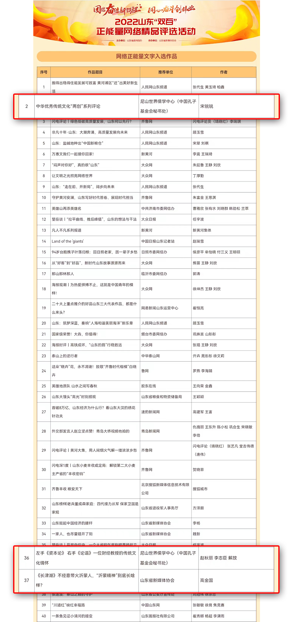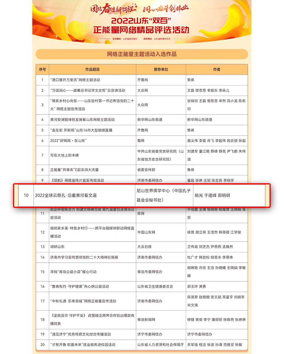 本次活动共评选出200件正能量网络精品,包括文字60件,图片40件,音视频60件,专题专栏20个,主题活动20个。其中由尼山世界儒学中心(中国孔子基金会秘书处)报送的《中华优秀传统文化“两创”系列评论》《左手<资本论> 右手<论语> 一位财经教授的传统文化情怀》两篇作品获评网络正能量文字精品,“2022全球云祭孔·沿着黄河看文庙”获评活动类网络精品。由山东省新媒体协会报送的《<长津湖>不经意带火沂蒙人,“沂蒙精神”到底长啥样?”》,获评网络正能量文字精品。