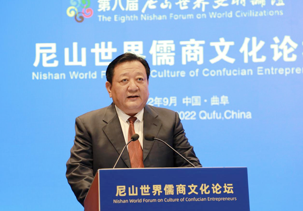 江成代表山东省人民政府,向尼山世界儒商文化论坛的召开表示祝贺。他指出,中华优秀传统文化是中华民族的根和魂,儒商文化作为中华优秀传统文化与社会主义先进文化相结合的文明成果,展现出旺盛的生命力和持久的感染力。他强调,山东作为儒家思想的重要发源地和儒商文化的重要传承地,要牢记习近平总书记嘱托,坚持把弘扬中华优秀传统文化作为重大政治任务,深入挖掘儒商文化精髓,不断将儒商文化发扬光大。要锚定“走在前、开新局”,高效统筹疫情防控和经济社会发展,聚力打造优良产业生态,为广大企业家和各类人才来鲁发展提供一流服务,创造良好环境。
